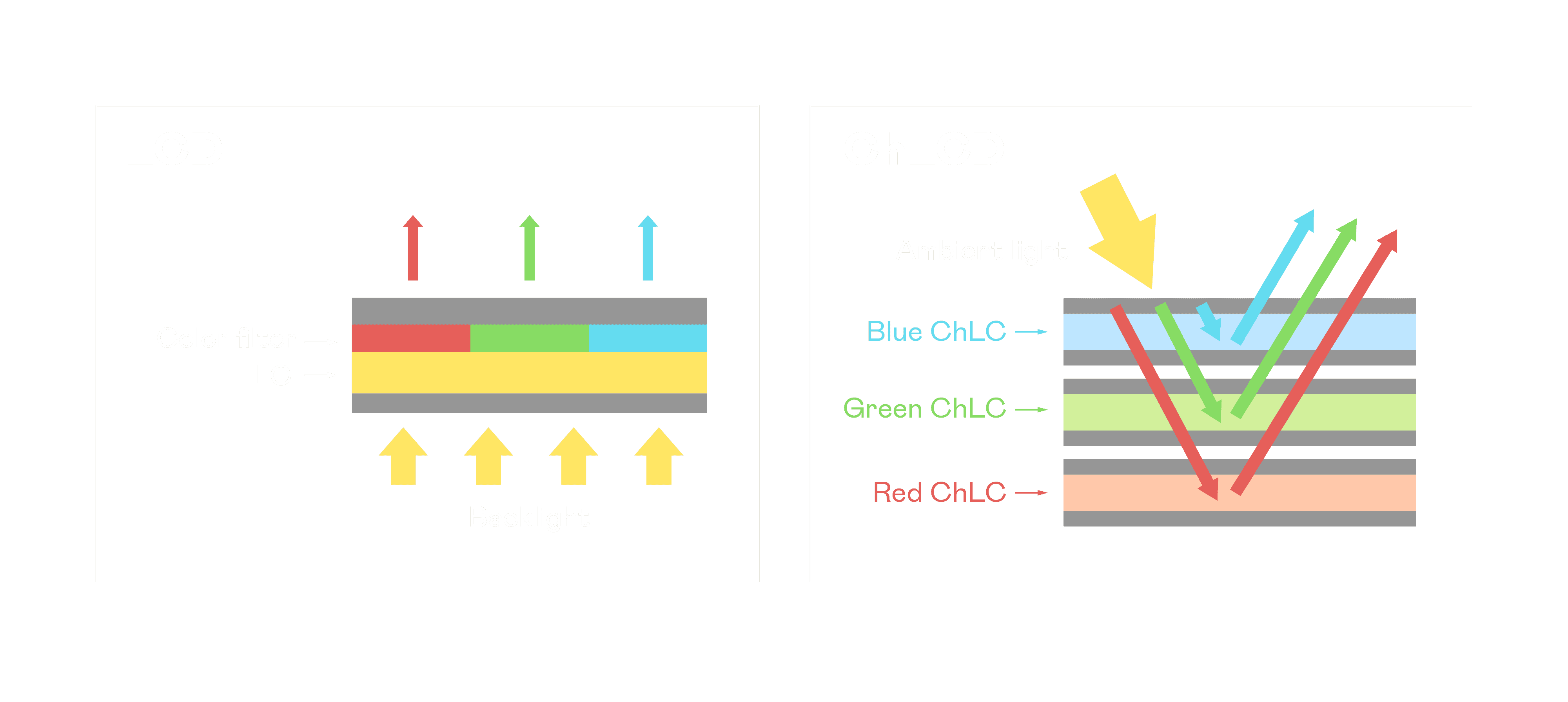 ChLCD 胆固醇液晶就如同纸张一样,,,,透过反射环境光来显示影像,,,因此长时间观看不易造成人眼视觉疲劳,,可达到护眼效果。。当处于户外阳光下使用,,,LCD 影像容易失真而不易观看,,,,但胆固醇液晶仍可维持较佳的影像品质。。。。